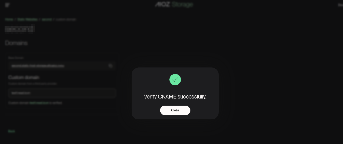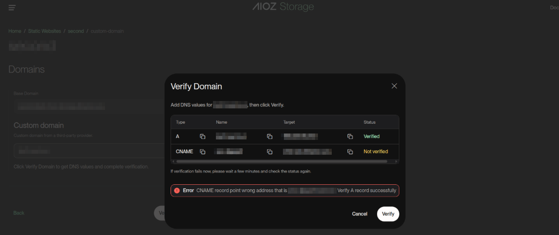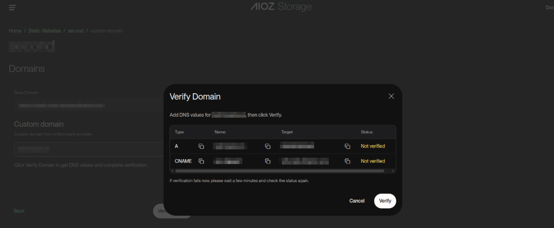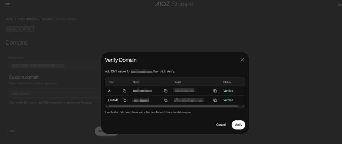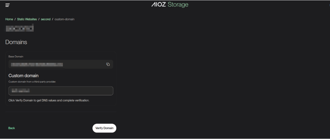 To ensure security and prevent domain hijacking, AIOZ Storage requires you to verify that you own the custom domain before it can be linked to your bucket.
